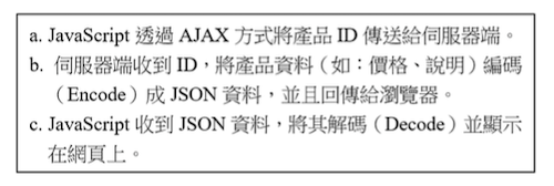 透過 AJAX 方式交換 JSON 資料,使用者在網頁中點選線上產品縮圖時,用以連結產品資料,系統執行下列動作順序為何?